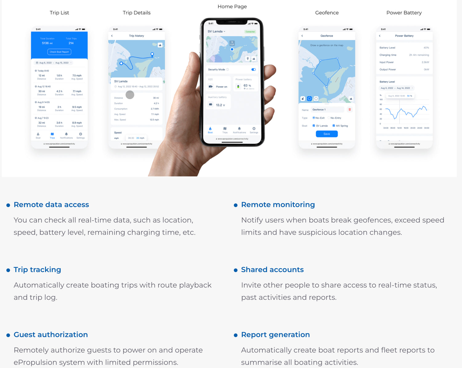 ePropulsion Connectivity Service is a value-added service enabling boat owners and fleet managers to communicate with their boats securely and reliably. It allows users to access cloud-based connectivity services without the need for additional accessories.