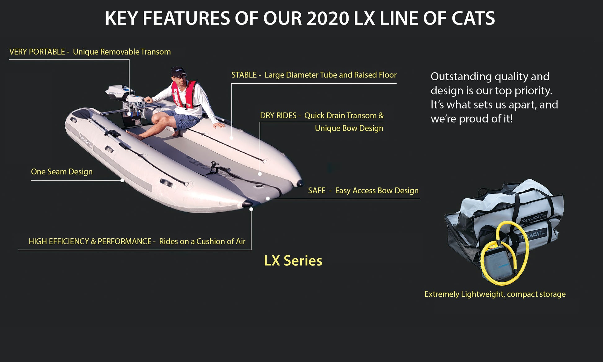 The Takacat 340LX inflatable catamaran is a firm favorite in the portable boat market. The extra waterline length helps provide quick and level planning. It's large flat deck provides a generous platform for fishing, diving and water enthusiasts. The wide Beam, large diameter tubes, raised floor and catamaran hull design all come together to create an extremely stable platform. Packed full of original Takacat innovations the LX 340 is in a class of its own on the water.A great option when snorkeling Key Largo or exploring Flamingo in Everglades National Park.